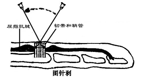 1.2治疗方法让患者平卧,患侧于掌心向上平放。以患指掌关节为中点作常规消毒、用5m1注射器6号针头抽吸2%利多卡因1m1、在皮下结节为穿刺点作局麻,针退至皮下留针,麻药显效后,术者双手常规消毒,右手持针头,左手拇指压住针尖,顺皮下结节一端,向另一端用力针剥2~3次,留针皮下,让病人活动患指,直到弹响声消失或活动自如为止,为针剥成功(见上图)。